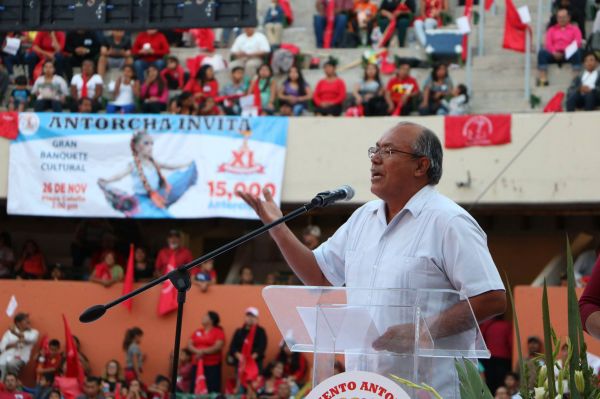 Hace once años emprendimos en Mexicali esta tarea desde cero y no ha sido nada fácil, como no la ha sido para el antorchismo en ninguna parte. Nos enfrentamos, entre diversas dificultades, al bloqueo de las autoridades estatales y municipales que canalizan los escasos apoyos y obras populares hacia su clientela política, y no hacia donde son más demandados, nos enfrentamos incluso a su franca represión. Hace tres años, el 24 de julio de 2014, el ala más reaccionaria del panismo cachanilla representada por el entonces alcalde, Jaime Diaz, golpeo a una pacífica manifestación antorchista y detuvo a cinco activistas, entre ellos al jefe de este seccional, el profesor Dióscoro Gómez, pensando que de esa manera iba a desbaratar a Antorcha, que por aquellas fechas no llegaba ni a dos mil agremiados. Pero hoy estamos aquí los antorchistas mexicalenses, como reza la canción del Cachanilla, orgullos y cumplidores, para decirles a los panuchos represores que estamos de pie, que ya no somos los mil quinientos de 2014, que con este evento les decimos que por ese camino no nos van a detener, que lo que más les conviene es resolver las demandas del pueblo, porque a Antorcha en Baja California no la para nadie, que vamos a seguir multiplicando las fuerzas del pueblo organizado hasta mandar al basurero a todos los políticos que se opongan al progreso del pueblo.
