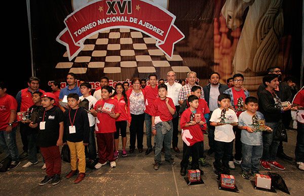 Los ganadores del XVI Torneo Nacional fueron: Luis Santiago Morales, en la categoría Infantil A; Vladimir Pantaleón Sandoval, en Infantil B; Manuel Moreno Cruz, de Juvenil A; Roberto Pérez, de Juvenil B; y Rafael Figueroa García de Juvenil C, quienes recibieron como premio un trofeo, un juego de ajedrez profesional y un reloj.