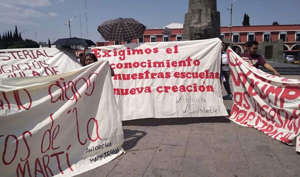El panorama en el estado es totalmente diferente, hace algunas semanas se iniciaron mítines frente a gobierno del estado por parte de maestros adheridos a Antorcha Magisterial (AM), a los cuales se sumaron alumnos de la escuela Vicente Riva Palacio y Bachillerato Coronel Nicolás Romero adheridos a la Federación Nacional de Estudiantes Revolucionarios Rafael Ramírez (FNERRR), esto se hizo como medida por la situación tan precaria que viven los maestros de dichas escuelas, a los cuales se les ha retenido el pago, no solamente de este inicio de semestre sino desde el año anterior se han visto reprimidos de manera administrativa por parte del Gobierno del Estado que encabeza Omar Fayad Meneses, pues el año anterior a los profesores se les pagó hasta finales de septiembre, después de nueve meses, recibieron su salario, a pesar de estas situaciones a las que han sido sometidos los profesores por parte del Gobierno del Estado, no abandonaron sus aulas y siguieron impartiendo las clases, por esta razón los jóvenes pertenecientes a estas instituciones se dispusieron a dar la lucha junto a sus profesores, es incomprensible cómo un gobernador puede someter de esa manera al sector principal que puede lograr el desarrollo del estado: "la educación de sus jóvenes".