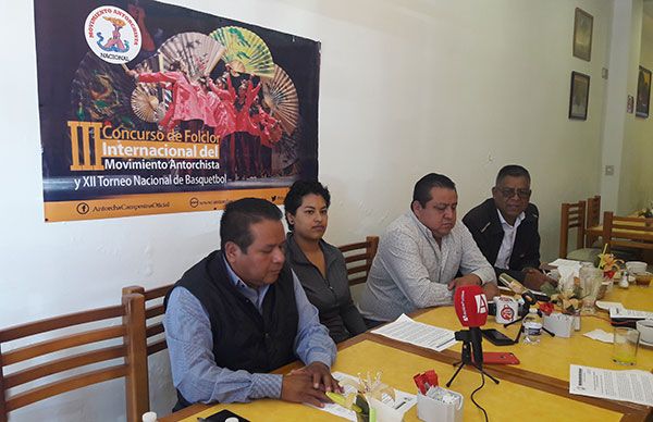 Zacatecas, Zac. Integrantes de la Comisión Cultural y Deportiva del Movimiento antorchista dieron una conferencia de prensa conjunta para anunciar la realización del III Encuentro de Folclor Internacional, que se llevará a cabo el 23 de septiembre en la Plaza de la Danza de la ciudad de Oaxaca, y el XII Torneo Nacional de Basquetbol, que se realizará en Michoacán los días 29 y 30 de septiembre y 1 de octubre.