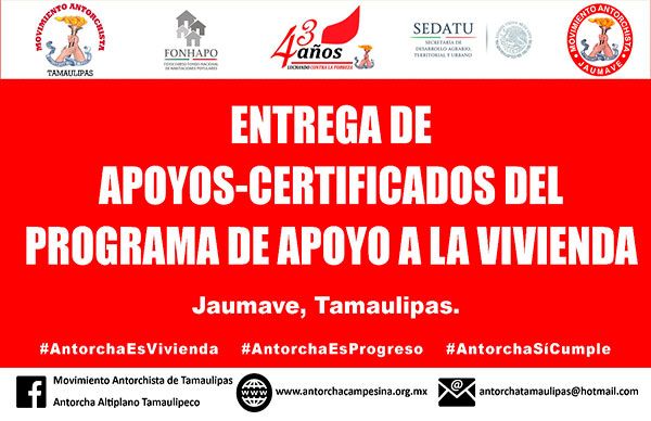 Jaumave, Tamaulipas. Campesinos de Jaumave, Tamaulipas, se dieron cita en el Teatro del Pueblo, con motivo de hacer entrega de certificados del Programa de apoyo a la vivienda de la Secretaría de Desarrollo Agrario, Territorial y Urbano (SEDATU), del ejercicio fiscal 2017.Apoyos que consisten en paquetes de mejoramiento de vivienda, en techos de lámina y muros de concreto, con lo que se beneficiarán más de 500 familias antorchistas del municipio.