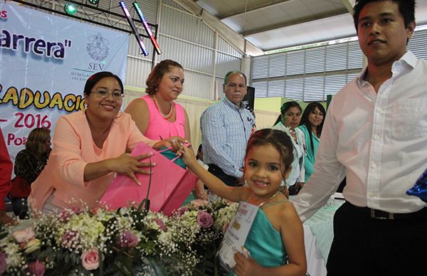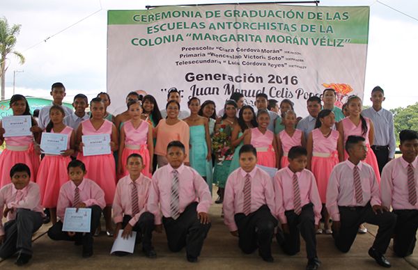 Egresando así la cuarta generación del Jardín de Niños "Clara Córdova Morán", la cuarta generación de la Primaria "Wenceslao Victoria Soto" y la tercera generación de la Telesecundaria "Luis Córdova Reyes" de la colonia Margarita Morán Véliz en donde 57 jóvenes terminaron sus estudios para avanzar al siguiente nivel académico el ciclo escolar que viene.